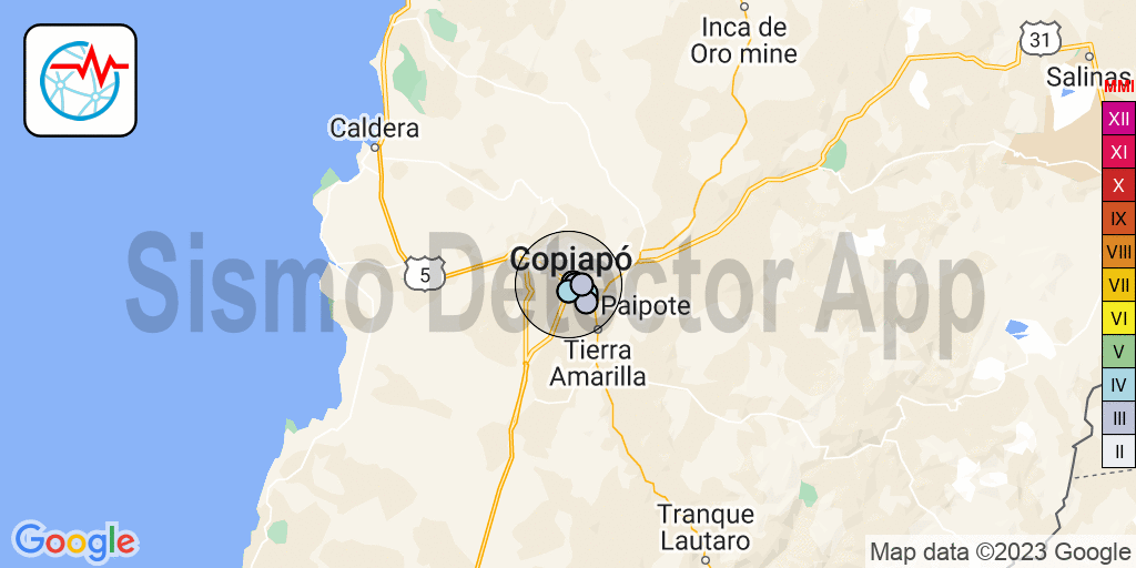 Earthquake at 2km from Copiapó, Chile. June 6, 2023 – 18:50 UTC Sismo News Team June 6, 2023 An earthquake was felt today, Tuesday 6 June 2023, 18:50 UTC, at 2km from Copiapó, Chile. The earthquake has been reported by 36 users of the Earthquake Network app in a radius of 58km. Preliminary magnitude between 3.8 and 4.4. Post navigation Previous Previous post: Earthquake at 31km from Kahramanmaraş, Türkiye. June 6, 2023 – 03:36 UTCNext Next post: Earthquake at 22km from Viña del Mar, Chile. June 7, 2023 – 01:52 UTC