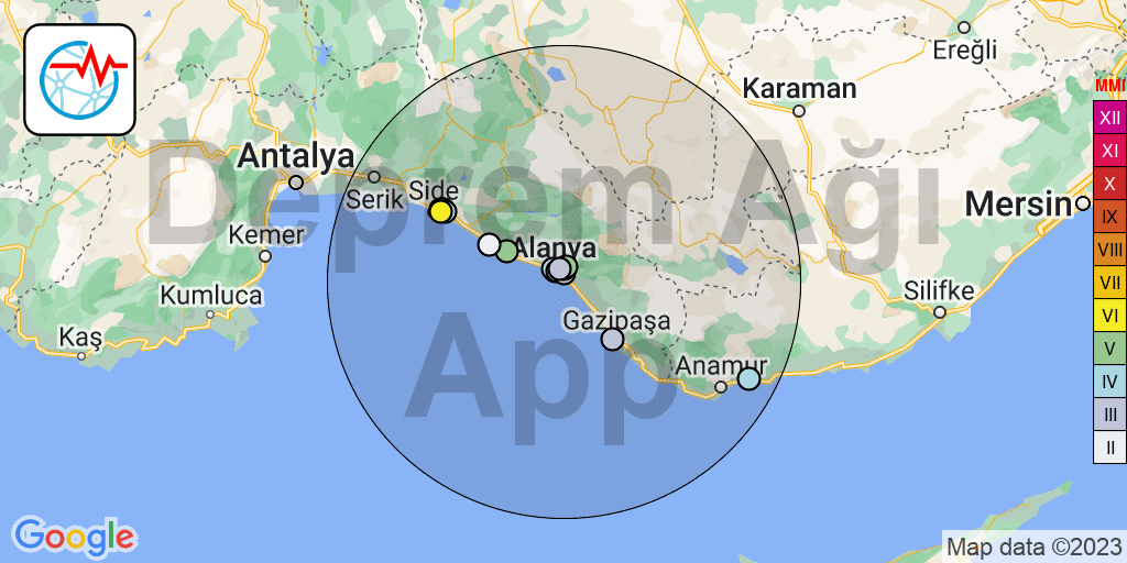 Earthquake at 4km from Alanya, Türkiye. November 11, 2023 – 09:12 UTC Sismo News Team November 11, 2023 An earthquake was felt today, Saturday 11 November 2023, 09:12 UTC, at 4km from Alanya, Türkiye. The earthquake has been reported by 85 users of the Earthquake Network app in a radius of 94km. Preliminary magnitude between 3 and 3.6. Post navigation Previous Previous post: Earthquake at 1km from Curicó, Chile. November 11, 2023 – 07:08 UTCNext Next post: Earthquake at 1km from Arequipa, Perú. November 11, 2023 – 09:26 UTC