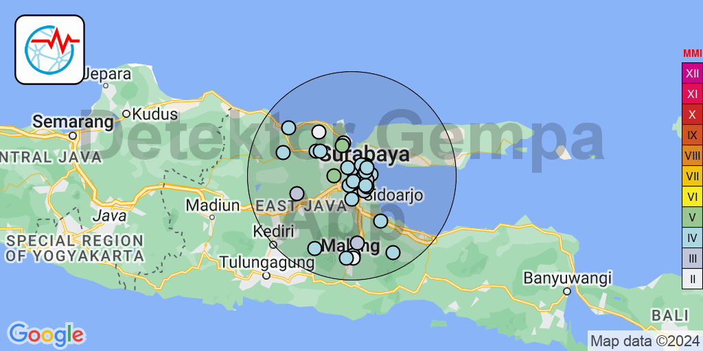 Earthquake at 5km from Surabaya, Indonesia. March 22, 2024 – 09:20 UTC Sismo News Team March 22, 2024 An earthquake was felt today, Friday 22 March 2024, 09:20 UTC, at 5km from Surabaya, Indonesia. The earthquake has been reported by 193 users of the Earthquake Network app in a radius of 80km. Preliminary magnitude between 4.1 and 4.7. Post navigation Previous Previous post: Earthquake at 15km from Surabaya, Indonesia. March 22, 2024 – 09:00 UTCNext Next post: Earthquake at 1km from Tocopilla, Chile. March 22, 2024 – 18:28 UTC